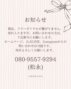 現在、フリーダイヤルが繋がりません。恐れ入りますが、お問い合わせの方は、下記番号にお願いします。080-9557-9294 (松永)ホームページ、公式LINE、Instagramからの、お問い合わ